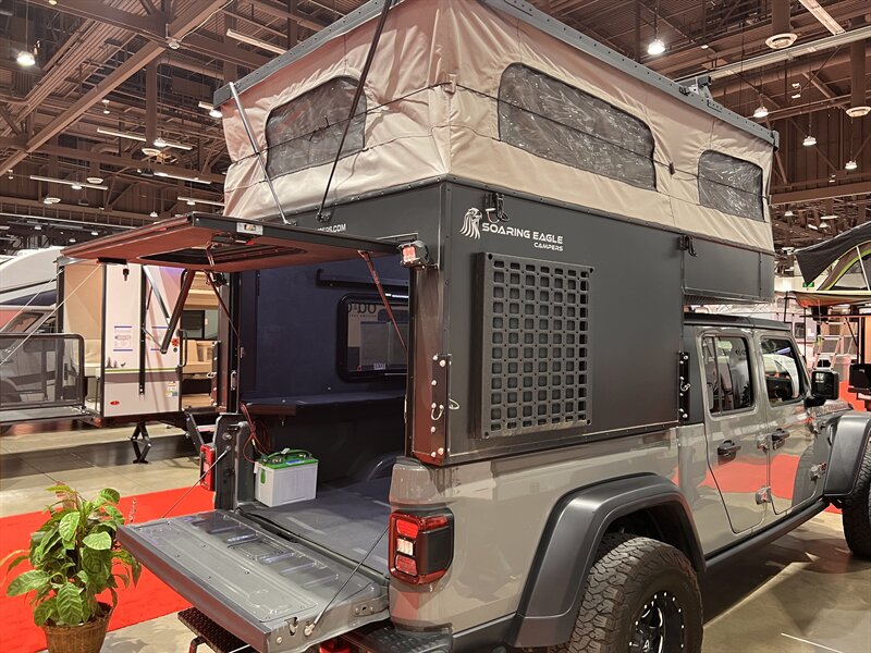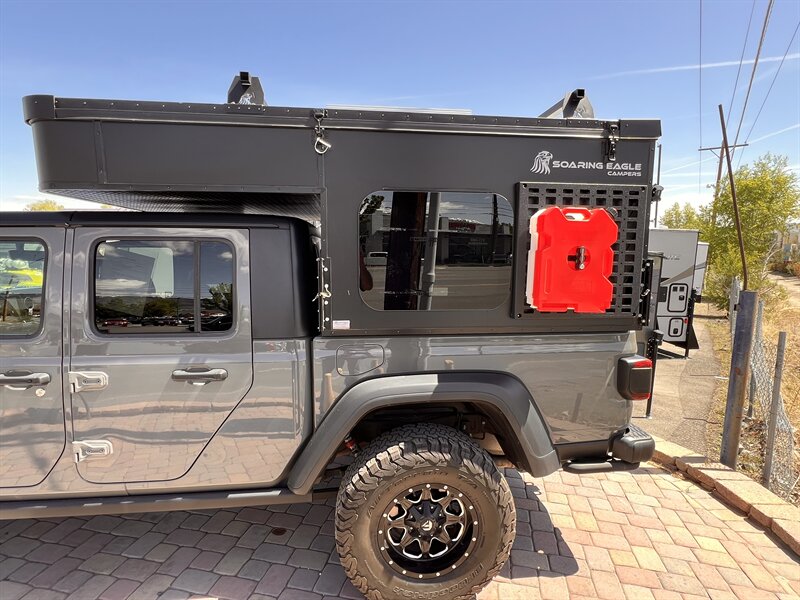 2024 Soaring Eagle OV-X 5.0 Lightweight pop-up truck topper All Aluminum Fits Gladiator, Tacoma, Maverick etc. Most midsize 5' bed trucks. Large pull out bed, 200 watt solar panel, quick release jacks, built in tie down straps(no extra install fees), docking lights, Molle racks with 2 Rotopax included, more! Also available in 5.5, 6.5, 8. models Now a high quality camper that allows you to still use your truck bed with camper installed! Base price $17,218 camp ready FOB factory. This model MSRP over $22K loaded with extras. Call 775-852-4888 for more info.